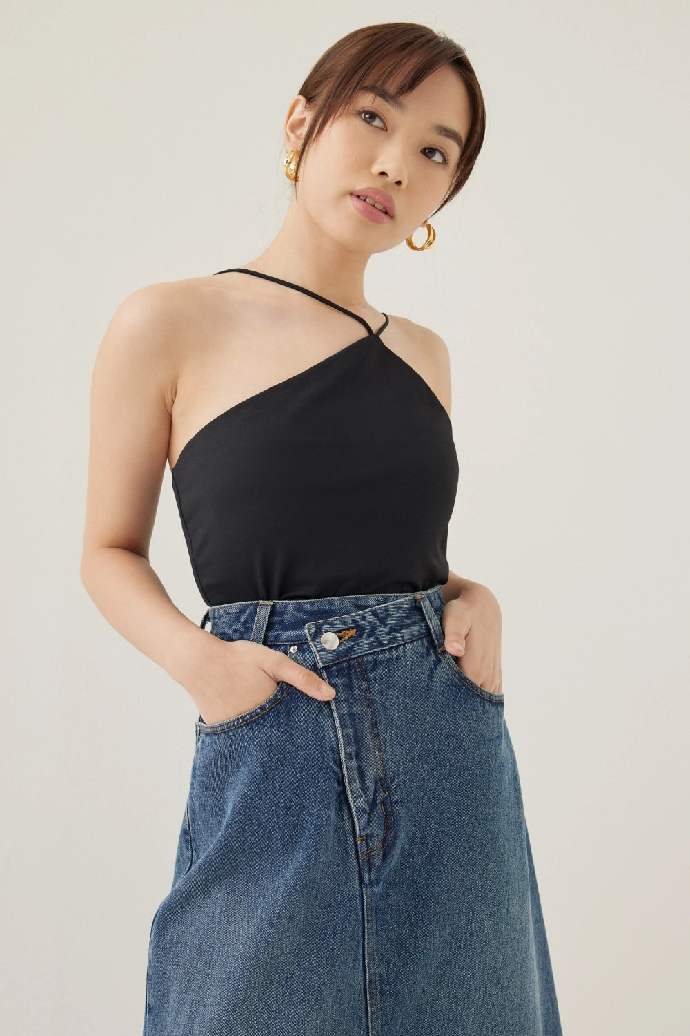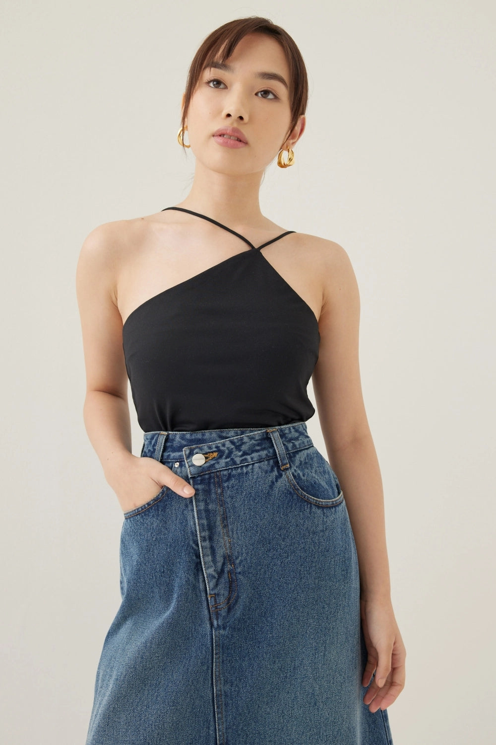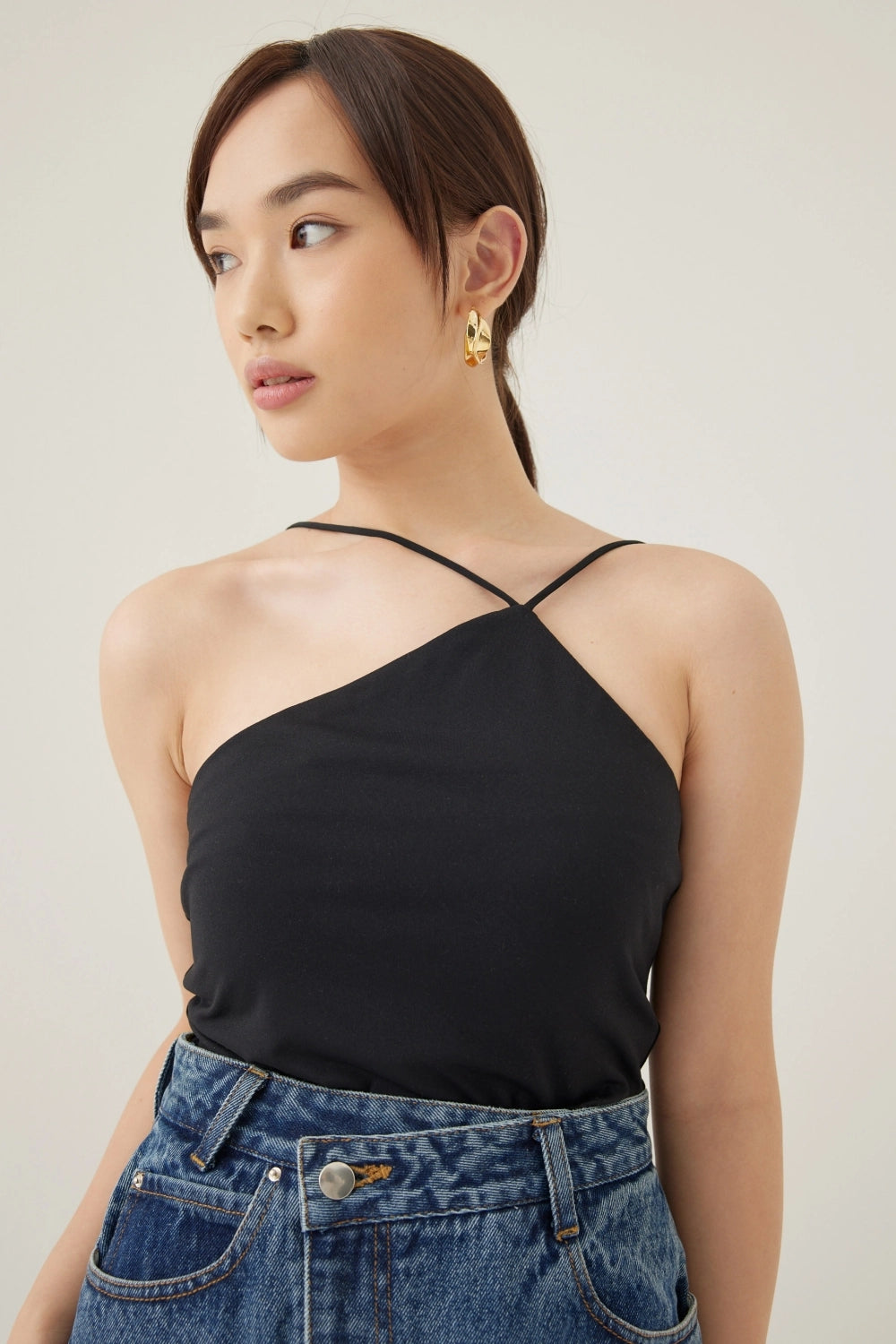 Type-Jakarta Black top, Color-Black, Neck type-asymmetric neck, Sleeve Length-Sleeveless, Fit-Body Fit, Fabric-Poly Lycra