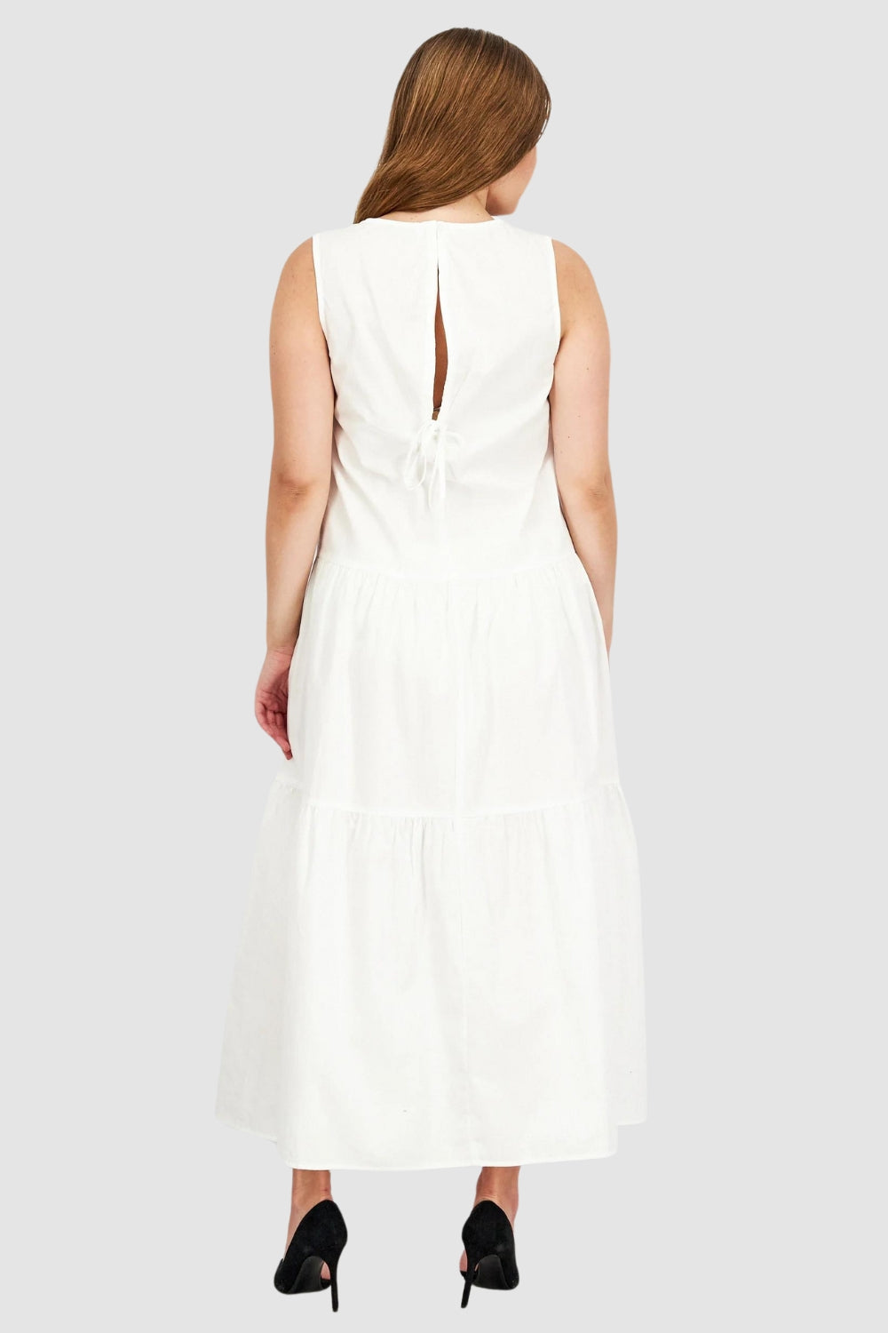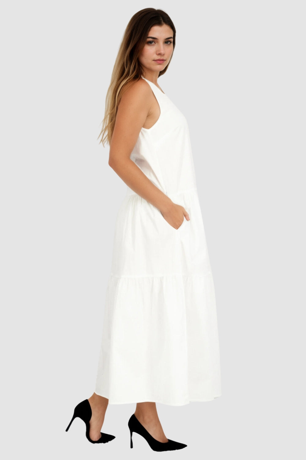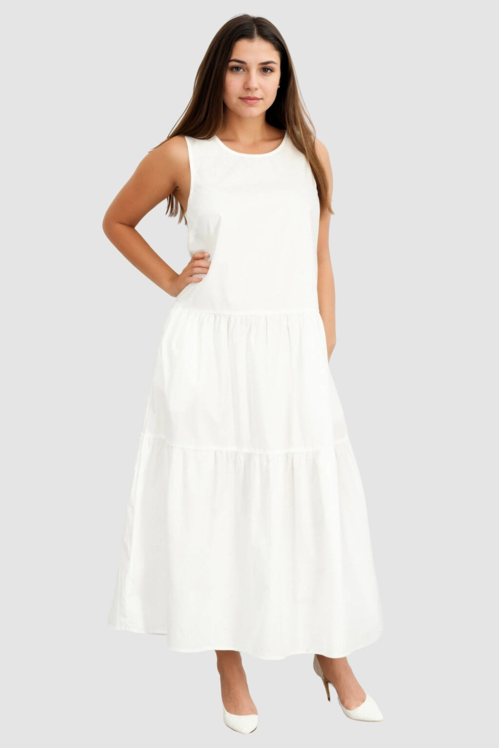 Type-Tyumen White Dress, Color-White, Neck type-Close neckline, Sleeve Length-Sleeveless, Fit-Relaxed, Fabric-Poplin